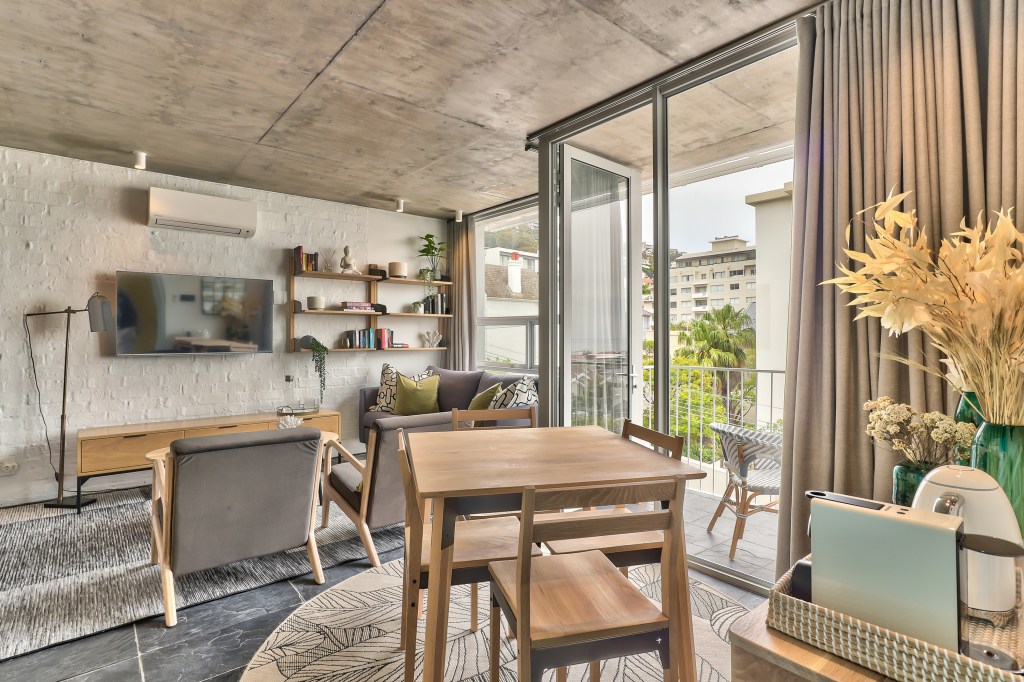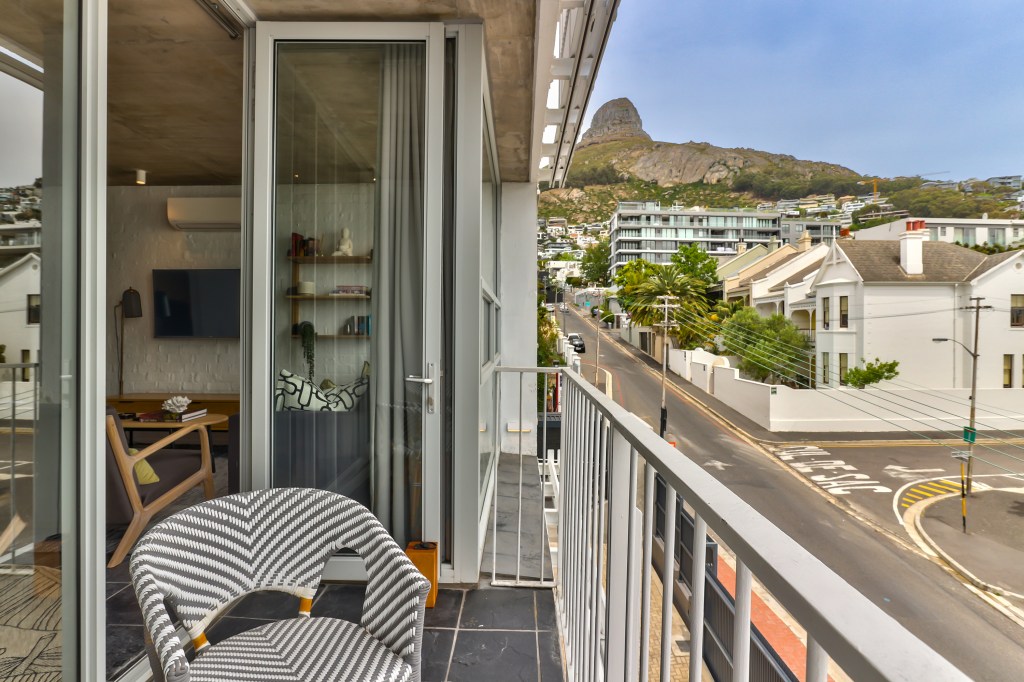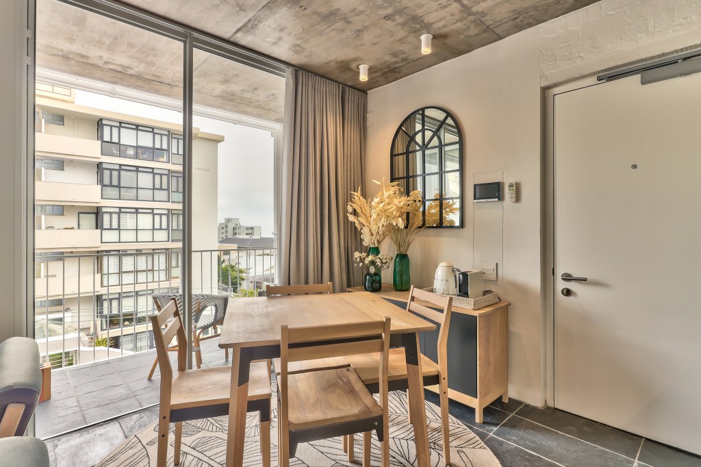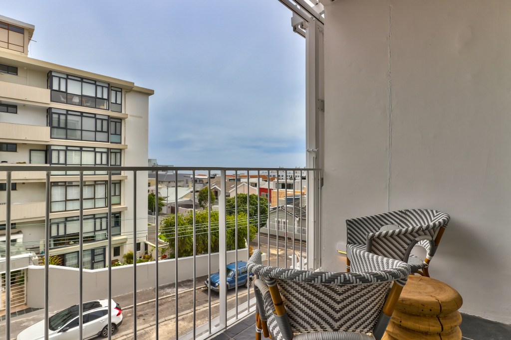 The open-plan layout seamlessly integrates a compact dining area, lounge, and sleeping zone, creating a cohesive and versatile space for guests. To enhance comfort and privacy, we installed lined wave curtains that block out light while still allowing guests to enjoy the beautiful sea views that make Sea Point so desirable.