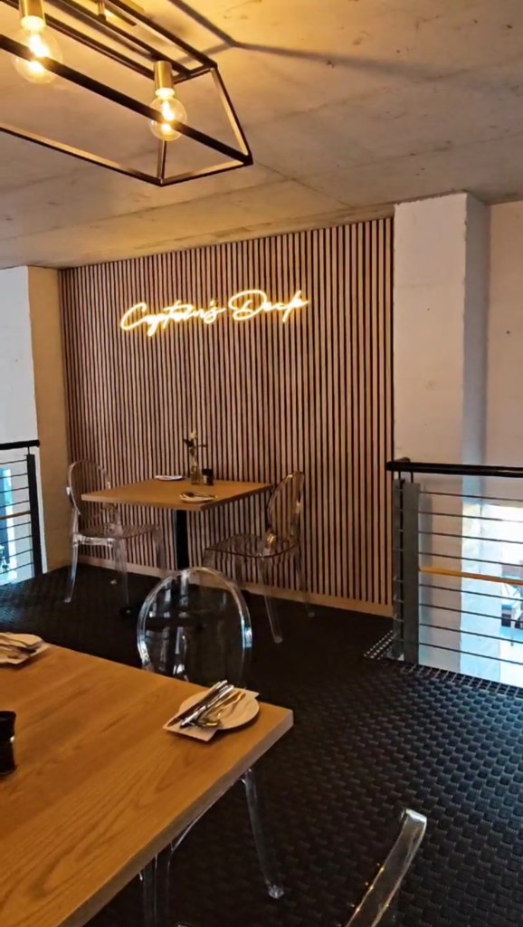 On the upper turbine mezzanine, new ghost chairs and compact tables were introduced to create the illusion of space. The wall recess was cladded with wooden acoustic panels and a custom neon sign reading “Captain’s Deck,” adding light and personality. The staircase was refitted with custom tread plates, non-slip coating, and strip lighting for safety and visibility.
