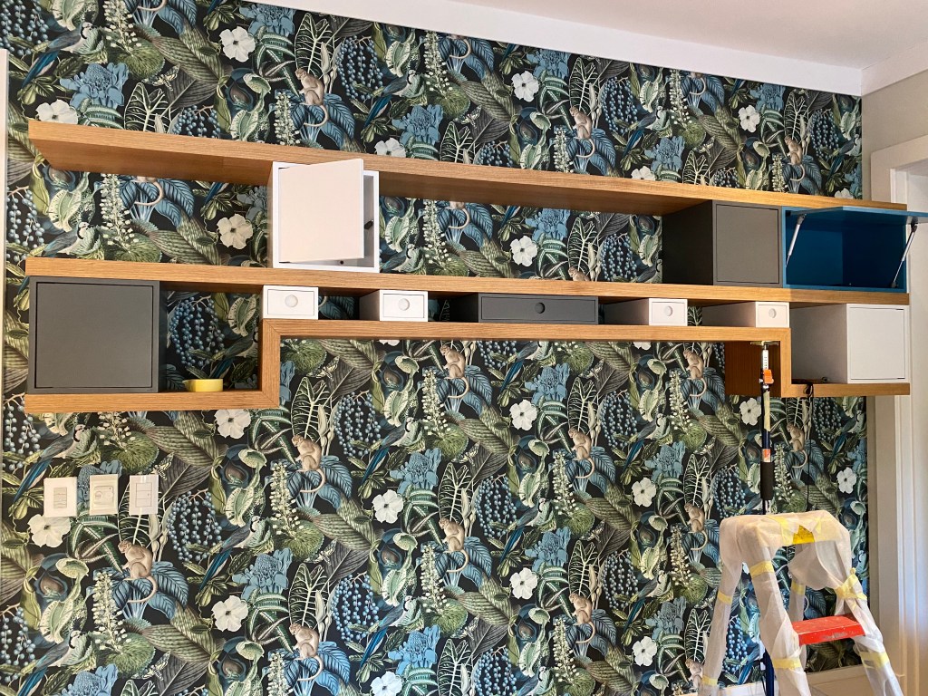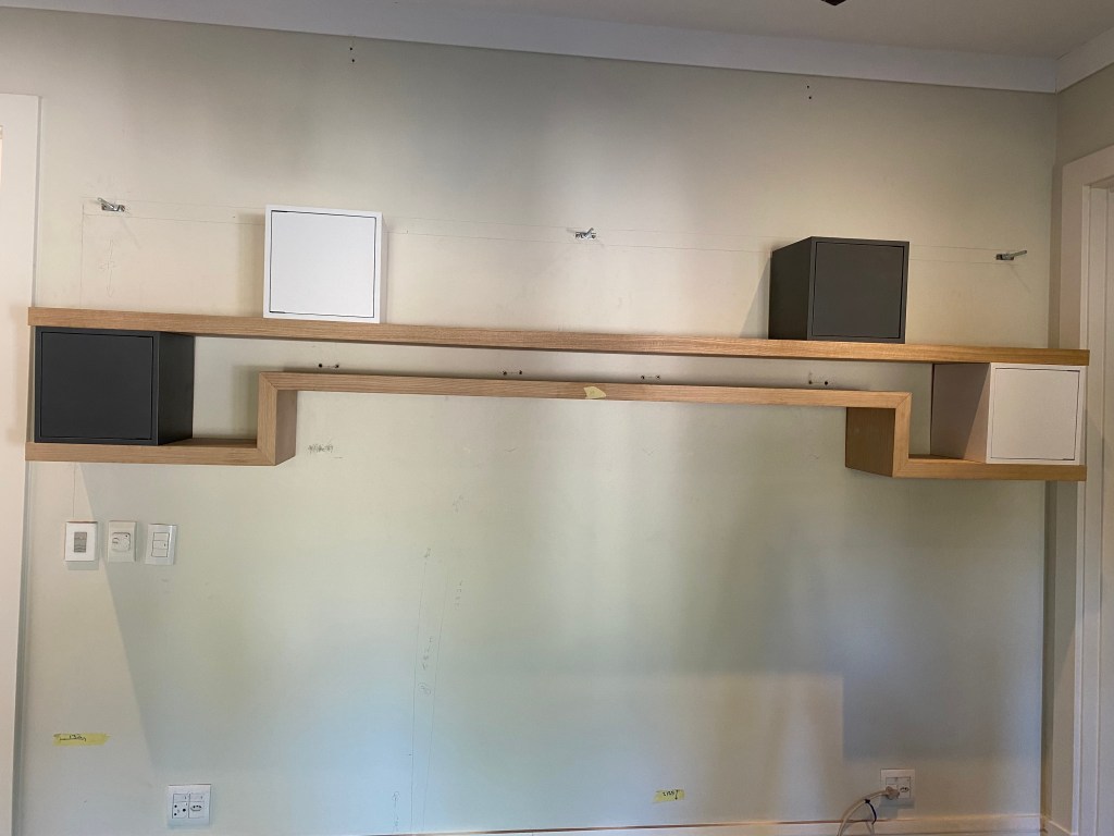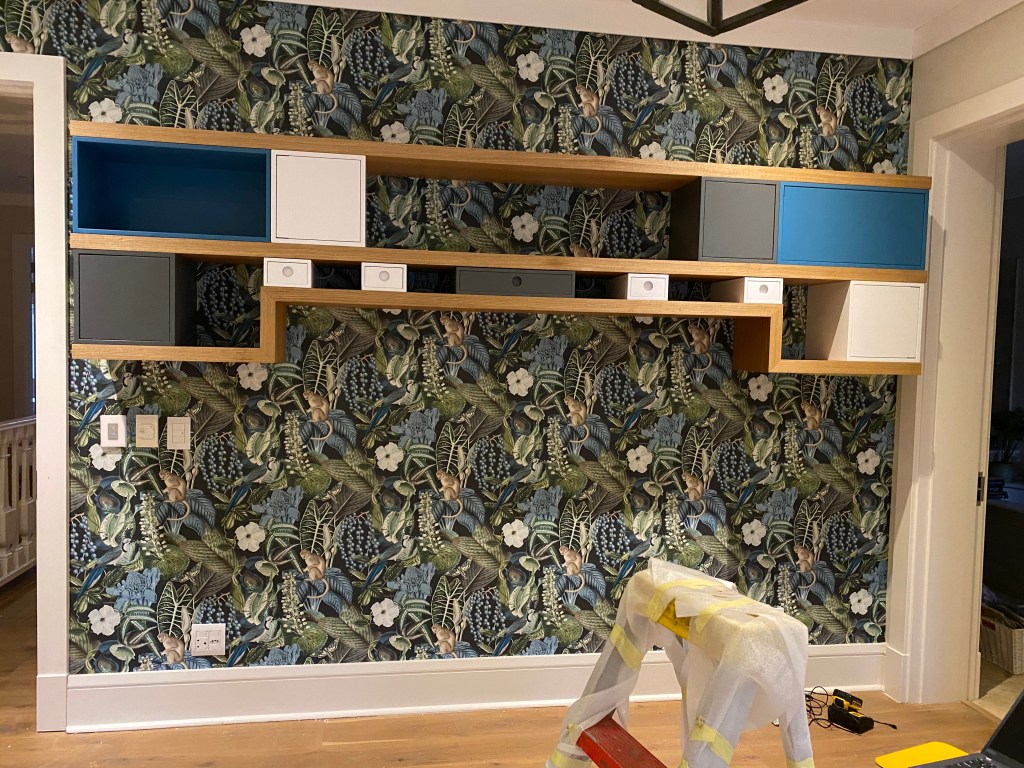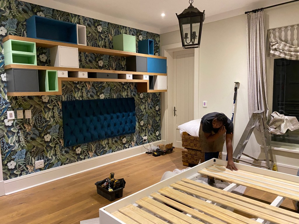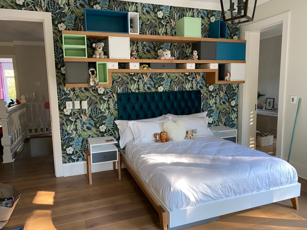 Floating wall shelves were installed to maximize vertical space and display personal items. Each shelf included small storage boxes for additional organization. Two of the boxes were securely bolted to the wall for extra support. Instead of traditional handles, we used push-latch mechanisms, keeping the design sleek, modern, and child-friendly.