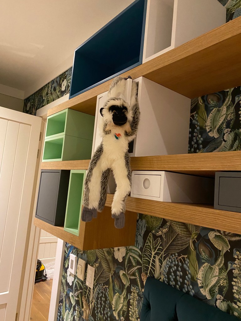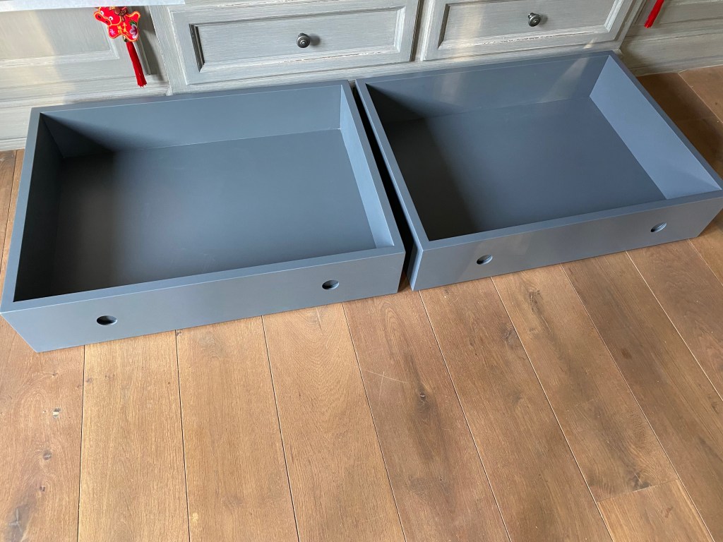 To optimize every inch of space, we designed two large grey storage boxes for each bedroom. These custom-built units slide neatly under the beds, providing extra storage for soft toys, books, and seasonal items.